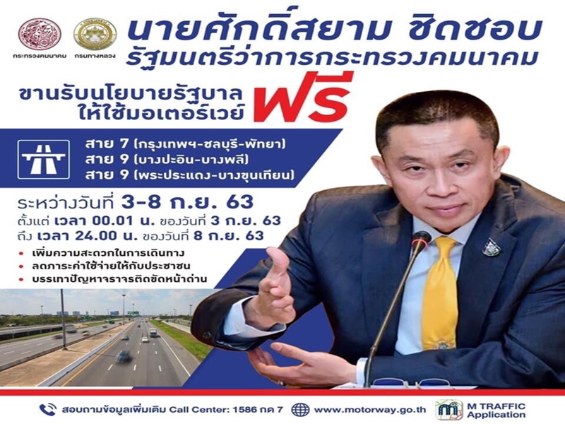 กระทรวงคมนาคมขานรับนโยบายรัฐบาลให้ใช้มอเตอร์เวย์ฟรี ระหว่างวันที่ 3 - 8 กันยายน 2563