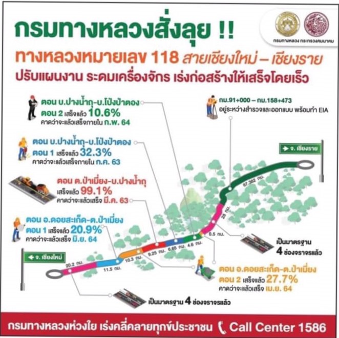 กรมทางหลวง ดำเนินโครงการก่อสร้างปรับปรุงทางหลวงหมายเลข 118 สายเชียงใหม่ - เชียงราย ระยะทางรวม 158 กิโลเมตร ด้วยการขยายถนนจากขนาด 2 ช่องจราจรไปกลับ (ด้านละ 1 ช่อง) เป็น 4 ช่องไปกลับ (ด้านละ 2 ช่อง) แล้วเสร็จ 48 กม. เพื่ออำนวยความสะดวกและปลอดภัยในการเดินทางของประชาชนรวมทั้งสนับสนุนการขนส่งสินค้าและการท่องเที่ยวของประเทศ ปัจจุบันได้ขยายช่องจราจรเพิ่มอีก 42.8 กม. วงเงินก่อสร้างรวม 2,ุ633,662,058 บาท โดยลงพื้นที่ก่อสร้างตั้งแต่ปี 61 แบ่งงานก่อสร้างเป็น 5 สัญญา ซึ่งสัญญาสุดท้ายจะส่งมอบงานภายในเดือน มิ.ย.64 นับเป็นเส้นทางสำคัญของการขนส่งสินค้าไปทาง อ.เชียงแสน อ.เชียงของ จ.เชียงราย เชื่อมต่อไปประเทศเพื่อนบ้าน สปป.ลาวและเมียนมา แต่เนื่องด้วยเส้นทางติดอุทยานแห่งชาติและเขตป่าไม้ มีต้นไม้หวงห้ามอยู่สองข้างทาง ซึ่งตามระเบียบของกรมอุทยานแห่งชาติสัตว์ป่าและพันธ์ุพืช กำหนดให้กรมทางหลวงสำรวจสัตว์ป่าและพันธุ์พืชที่คาดว่าจะได้รับผลกระทบจากการดำเนินโครงการฯ จากนั้นนำมาเปรียบเทียบกับการทำรายงานวิเคราะห์ผลกระทบสิ่งแวดล้อม (อีโอเอ) เมื่อดำเนินการเสร็จ กรมอุทยานฯ จะต้องพิจารณาก่อนอนุญาตให้เข้าพื้นที่และล้อมย้ายต้นไม้ออกจากพื้นที่เขตทาง