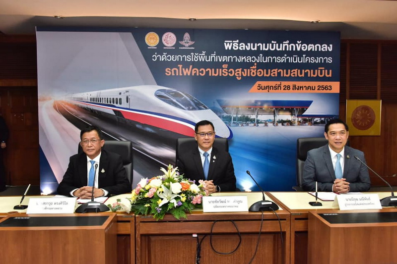 วันนี้ 28 ส.ค.63 (เวลา 13.30 น.) นายสราวุธ ทรงศิวิไล อธิบดีกรมทางหลวง ร่วมลงนามในบันทึกข้อตกลงว่าด้วยการใช้พื้นที่เขตทางหลวงในการดำเนินโครงการรถไฟความเร็วสูงเชื่อมสามสนามบิน ระหว่างการรถไฟแห่งประเทศไทย และกรมทางหลวง ณ ห้องประชุม 2 อาคาร 2 ชั้น 4 กระทรวงคมนาคม โดยมีนายชัยวัฒน์ ทองคำคูณ ปลัดกระทรวงคมนาคม เป็นประธานในพิธีลงนามฯ นายนิรุฒ มณีพันธ์ ผู้ว่าการรถไฟแห่งประเทศไทย กล่าวรายงานความเป็นมา รายละเอียดของโครงการฯ และลงนามฯ และอธิบดีกรมทางหลวง กล่าวให้ความร่วมมือและสนับสนุนการดำเนินโครงการฯ และลงนามฯ พร้อมนี้ นายอภิชาติ จันทรทรัพย์ รองอธิบดีกรมทางหลวง (รองอธิบดีฝ่ายวิชาการ) นายสุจิตต์ เชาว์ศิริกุล รองผู้ว่าการรถไฟแห่งประเทศไทย (รองผู้ว่าการกลุ่มบริหารรถไฟฟ้า) ร่วมลงนามในบันทึกข้อตกลงฯ โดยมีผู้บริหารกระทรวงคมนาคม กรมทางหลวง และการรถไฟแห่งประเทศไทยเข้าร่วมพิธีฯ ด้วย