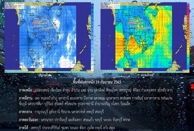 ทั้งนี้ วันที่ 19 ก.ย. 63 พื้นที่เสี่ยง ได้แก่ ภาคเหนือ คือ แม่ฮ่องสอน เชียงใหม่ ลำพูน ลำปาง แพร่ น่าน อุตรดิตถ์ พิษณุโลก เพชรบูรณ์ พิจิตร กำแพงเพชร สุโขทัย ตาก ด้านภาคอีสาน คือ เลย หนองบัวลำภู อุดรธานี หนองคาย บึงกาฬ นครพนม มุกดาหาร สกลนคร กาฬสินธุ์ มหาสารคาม ขอนแก่น ชัยภูมิ นครราชสีมา บุรีรัมย์ สุรินทร์ ศรีสะเกษ อุบลราชธานี อำนาจเจริญ ยโสธร ร้อยเอ็ด ขณะที่ ภาคกลาง คือ กาญจนบุรี อุทัยธานี ชัยนาท นครสวรรค์ ลพบุรี สระบุรี ขณะที่ภาคตะวันออก คือ นครนายก ปราจีนบุรี ฉะเชิงเทรา สระแก้ว ชลบุรี ระยอง จันทบุรี ตราด ในส่วนของภาคใต้ คือ เพชรบุรี ประจวบคีรีขันธ์ ชุมพร ระนอง พังงา ภูเก็ต กระบี่ ตรัง สตูล