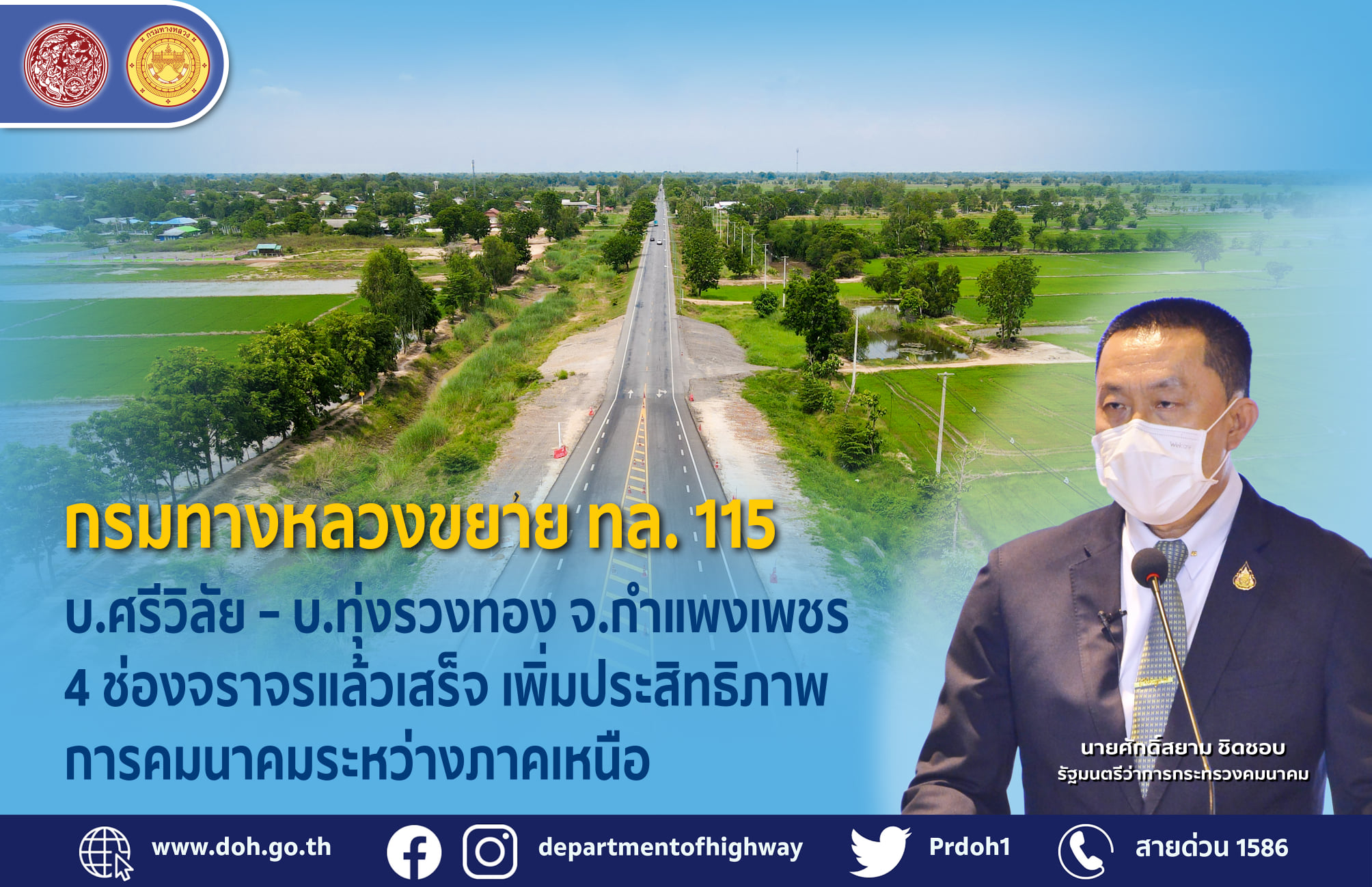กรมทางหลวงขยาย ทล.115 บ.ศรีวิลัย – บ.ทุ่งรวงทอง จ.กำแพงเพชร 4 ช่องจราจรแล้วเสร็จ เพิ่มประสิทธิภาพการคมนาคมระหว่างภาคเหนือ