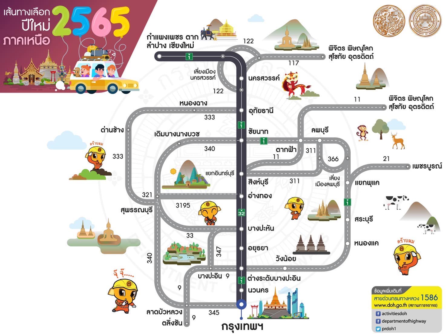 หากประชาชนต้องการสอบถามข้อมูลการเดินทางเพิ่มเติมหรือแจ้งเหตุด่วนเหตุร้ายระหว่างเดินทาง สามารถติดต่อได้ที่สายด่วนกรมทางหลวง 1586 (โทรฟรีทุกเครือข่ายตลอด 24 ชั่วโมง) สายด่วนมอเตอร์เวย์ 1586 กด 7 และตำรวจทางหลวง 1193