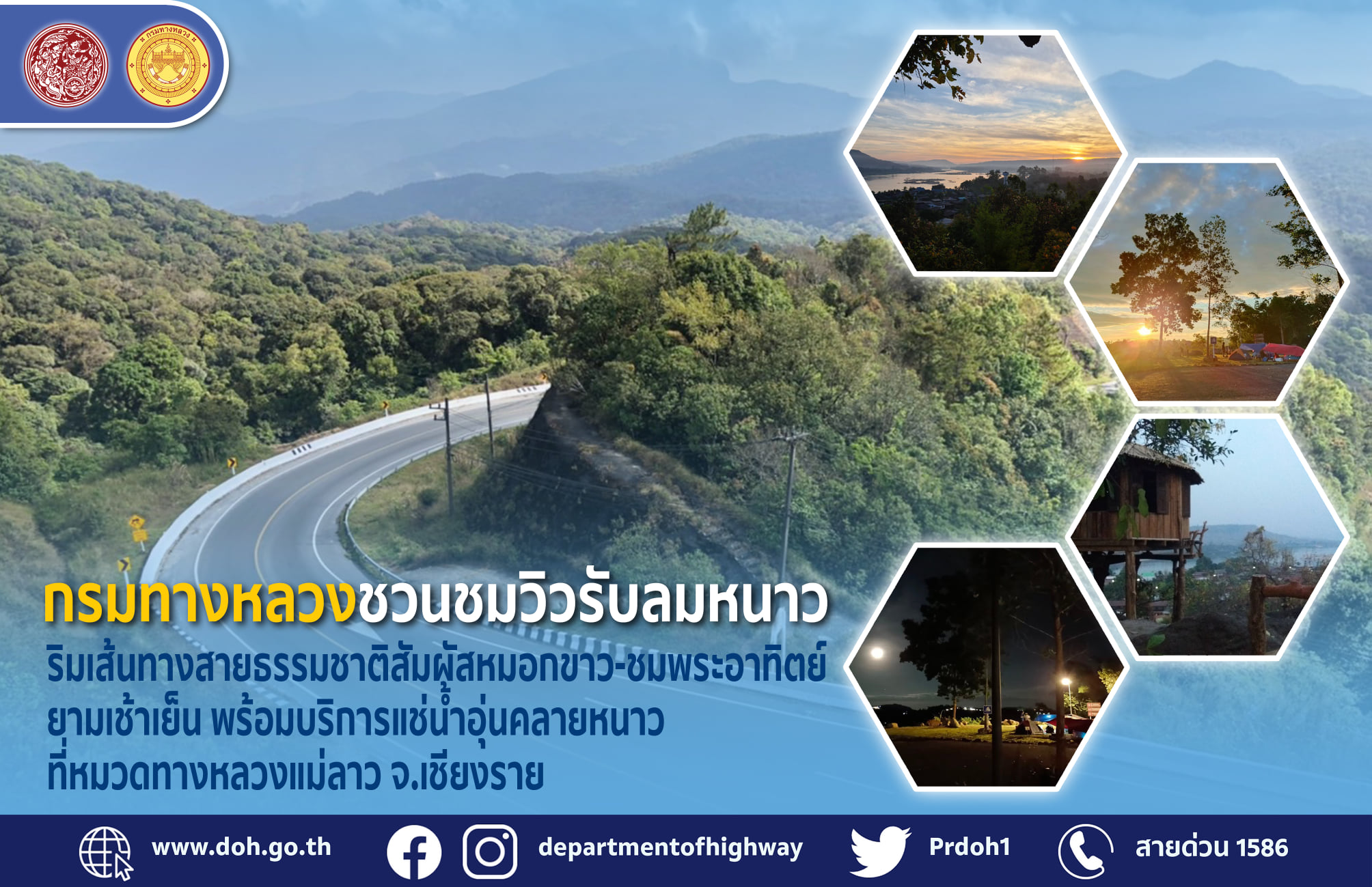 กรมทางหลวงขานรับนโยบายของรัฐบาลและรัฐมนตรีว่าการกระทรวงคมนาคมร่วมสนับสนุนการท่องเที่ยวภายในประเทศและกระตุ้นเศรษฐกิจท้องถิ่นในช่วงปลายเดือนธันวาคมถึงต้นเดือนมกราคมซึ่งเป็นเดือนที่อยู่ในช่วงฤดูหนาวและช่วงเทศกาลปีใหม่ ขอเชิญชวนนักเดินทางท่องเที่ยวแบบวิถีใหม่ (New Normal) เน้นการดูแลสุขภาพและความปลอดภัย สูดอากาศบริสุทธิ์ที่จุดชมวิวริมเส้นทางสายธรรมชาติสัมผัสหมอกหน้าหนาวยามเช้าชมแสงแรกของ พระอาทิตย์หรือจะชมความงามของพระอาทิตย์ตกดินในยามเย็น ซึ่งเป็นทิวทัศน์สวยงามหลายเส้นทางด้วยกัน คือ