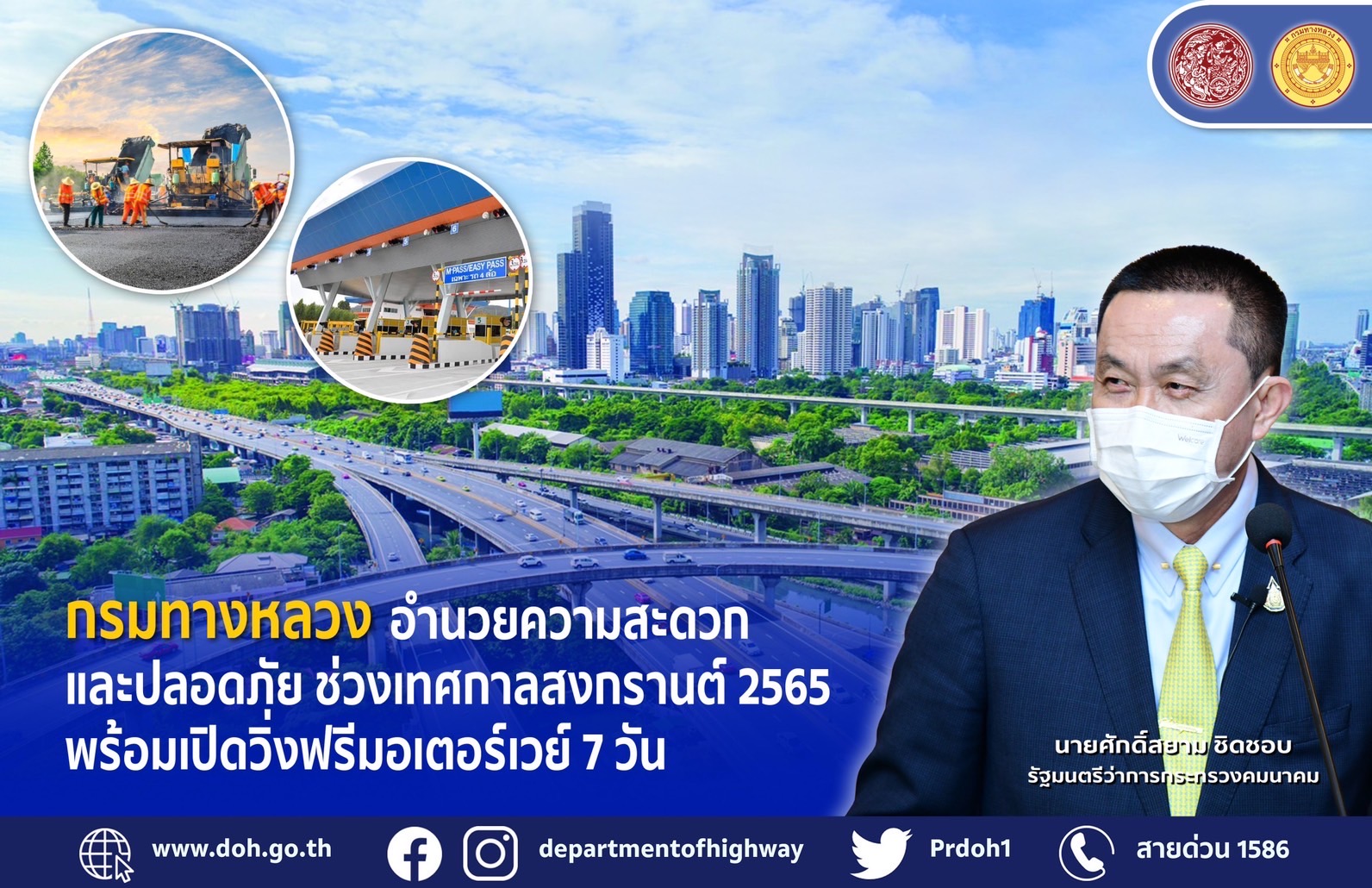 นายสราวุธ ทรงศิวิไล อธิบดีกรมทางหลวง เปิดเผยว่า ในช่วงเทศกาลสงกรานต์ที่จะถึงนี้คาดว่าจะมีประชาชนเดินทางกลับภูมิลำเนาและท่องเที่ยวเป็นจำนวนมาก กรมทางหลวงจึงได้เตรียมความพร้อมในการอำนวยความสะดวกและปลอดภัย ระหว่างวันที่ 11 – 17 เมษายน 2565 เพื่อรองรับการเดินทางของประชาชนสู่ภูมิภาคต่างๆ ซึ่งเป็นไปตามข้อสั่งการของนายศักดิ์สยาม ชิดชอบ รัฐมนตรีว่าการกระทรวงคมนาคม โดยให้สำนักงานทางหลวงและแขวงทางหลวงทั่วประเทศ ดำเนินการตรวจสอบป้ายจราจร สัญญาณไฟจราจร ไฟฟ้าแสงสว่างให้พร้อมใช้งาน ตรวจสอบและแก้ไขจุดเสี่ยงและจุดอันตราย พร้อมบำรุงรักษาทางหลวงให้อยู่ในสภาพดีและมีรถบริการช่วยเหลือฉุกเฉิน เมื่อผู้ใช้ทางเกิดอุบัติเหตุหรือรถเสีย อีกทั้ง ได้ขอความร่วมมือผู้รับจ้างคืนผิวทางในพื้นที่ก่อสร้างทุกโครงการ ซึ่งหากพบว่ามีปริมาณจราจรหนาแน่นจะทำการประสานงานกับตำรวจทางหลวง เพื่อสนับสนุนการอำนวยความสะดวกด้านการจราจรหรือการจัดช่องทางพิเศษ (Reversible Lane) ส่งผลให้การเดินทางของประชาชนเป็นไปอย่างสะดวกรวดเร็วยิ่งขึ้น